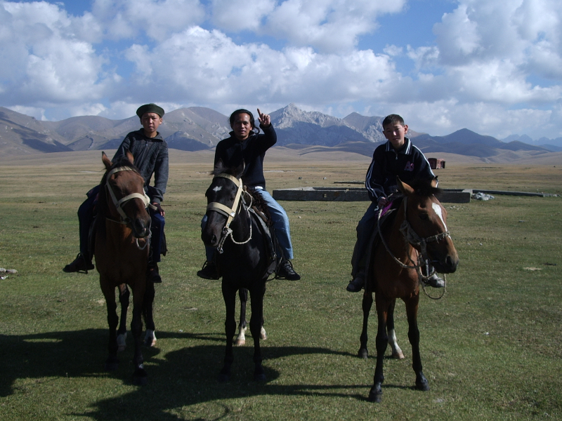 Six with children on horseback in the highlands of Song-kul Kyrgyzstan… home to the blue-eyed Kyrgyz and over the mountains behind us… China.