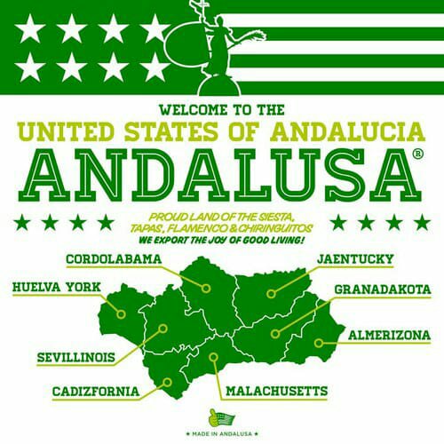 From the picture, the names of the provinces of Andalucia have a “hybridized” name with a corresponding American state. So, for example, Cordoba and Alabama became Cordolabama and Cadiz (where we live) and California became Cadizfornia, while Almeria and Arizona joined to make Almerizona. You get the point.