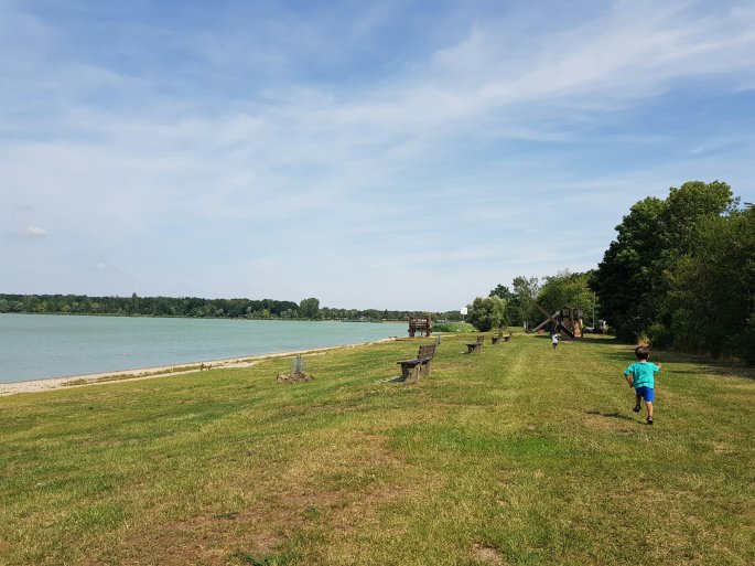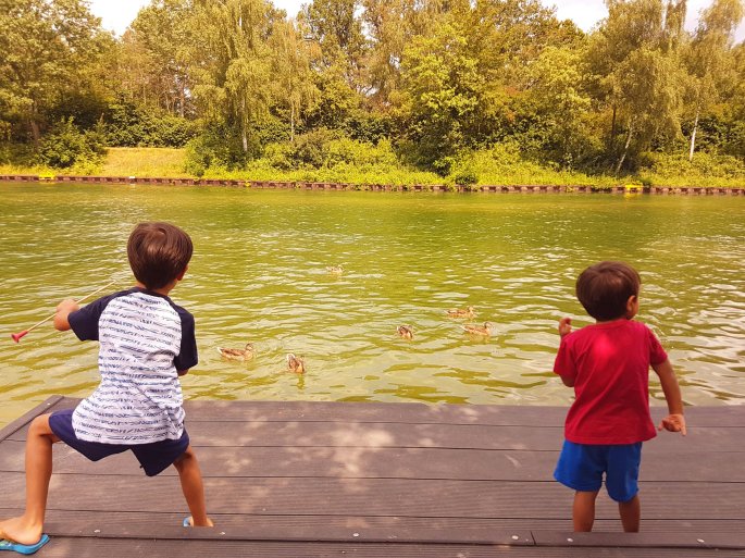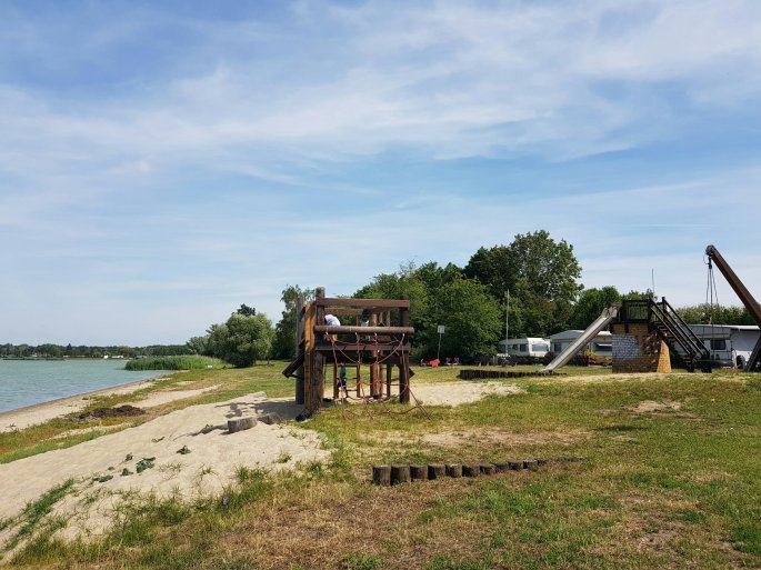 A rustic playground next to Barleber See (lake). Kaj rushes in… but Karol got there first!