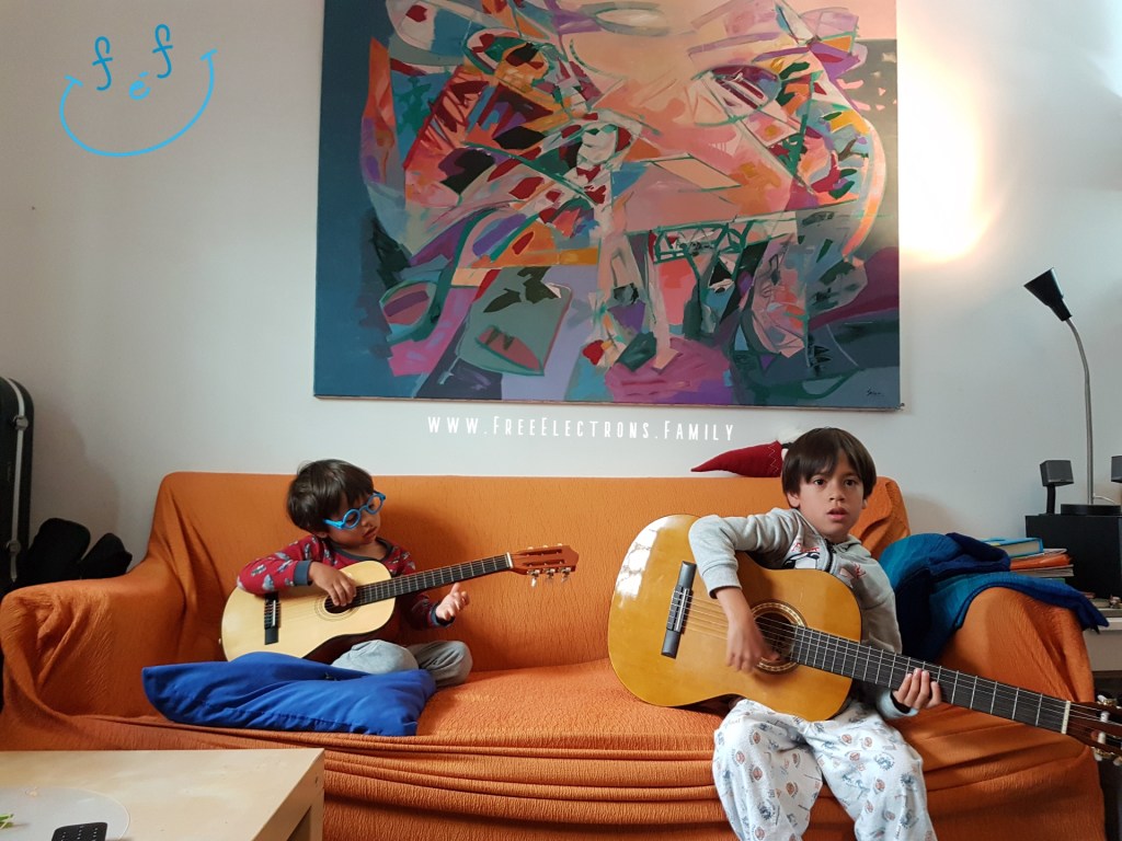 Then another 15 minutes of me (the happy househusband dad) teaching the kids to play the guitar or palmas (handclapping por Buleria), percussions or other instruments that we have at home. This way it’s not to hard for their fingers and much easier for muscle memory to develop, and still in line with their attention span.
