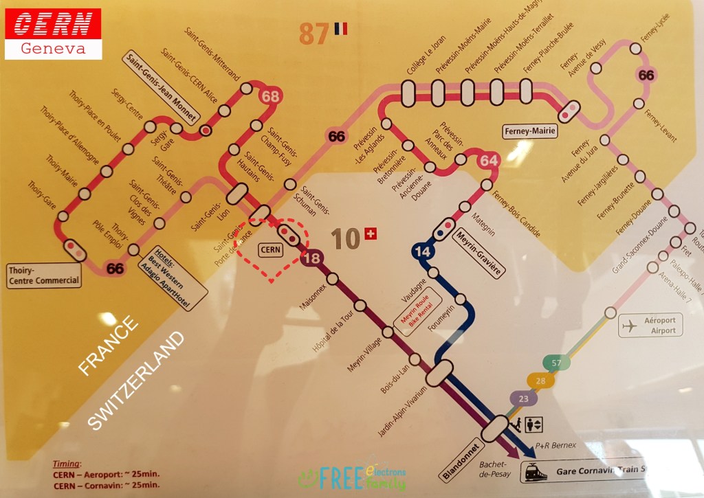 - Train/Tram. If you don’t have a car you can get to CERN via the purple tram/train 18. See the the picture map for details. CERN is about 25 minutes to the main train station and 25 minutes from the airport (where you can also get an 80-minute FREE train ride to CERN, apparently).