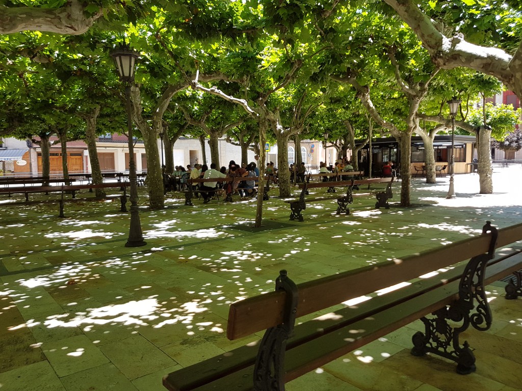 The town’s main square is quite charming, with mask-free, summer revelers enjoying tapas and drinks at a couple of restaurant/bars under trees whose leafy branches seem to open up to the sky, embrace each other and form a shadeful canopy to give the mortals below some respite from the summer heat.