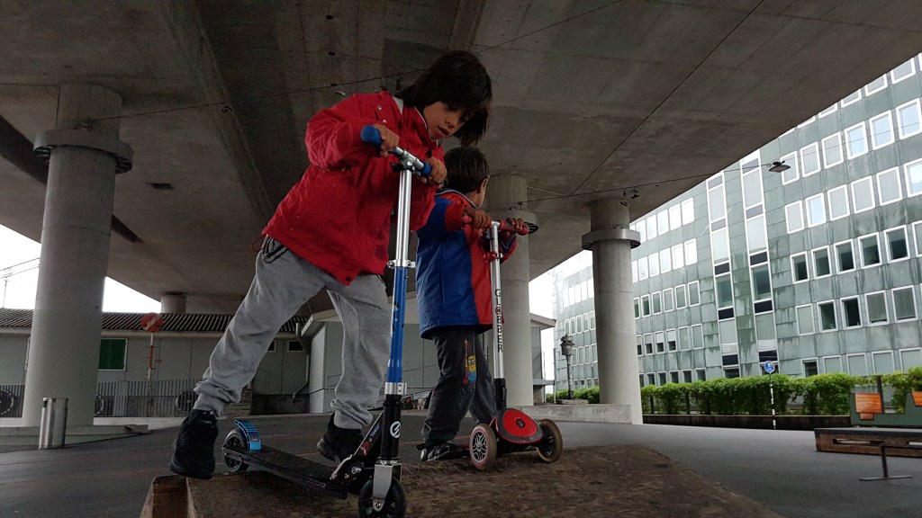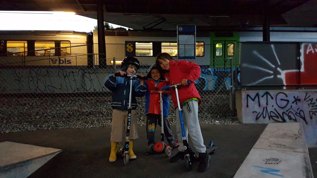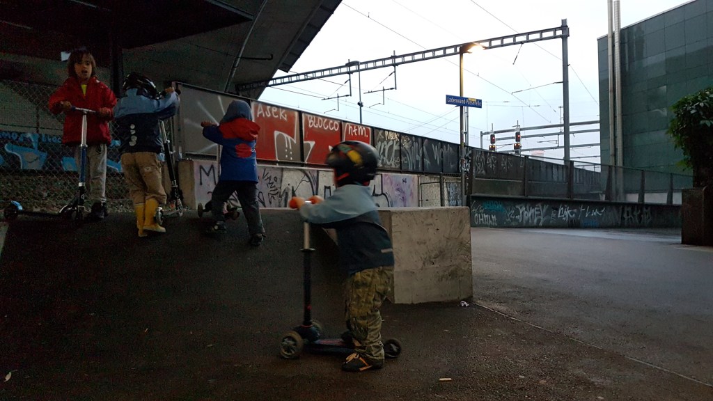With some other bigger kids taking over the skate park, our little gang moved to an improvised scooter ramp nearer the trains.