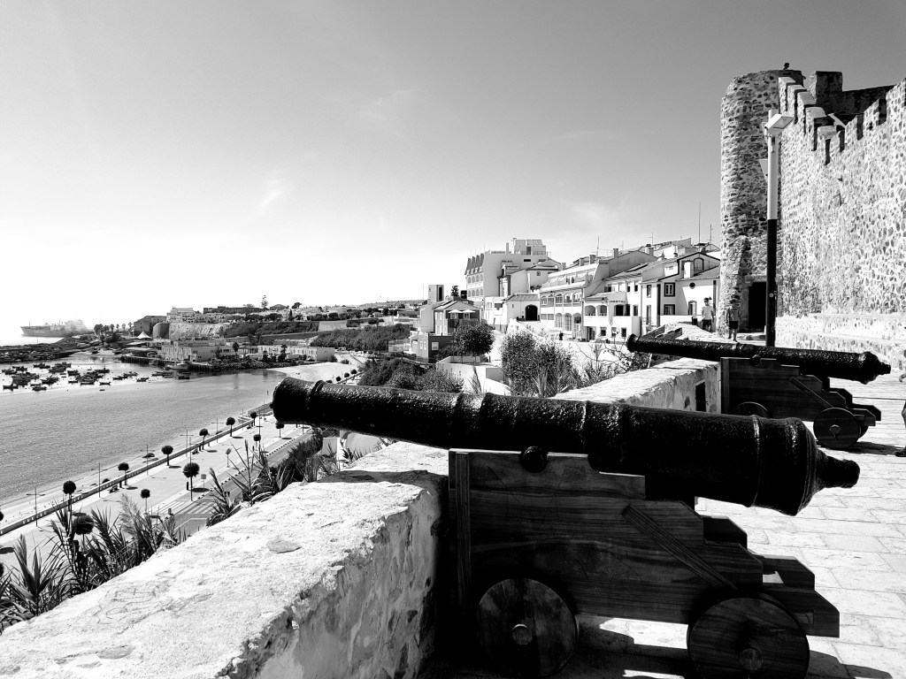 Old artillery canons aimed over the first port of Portugal at Sines.