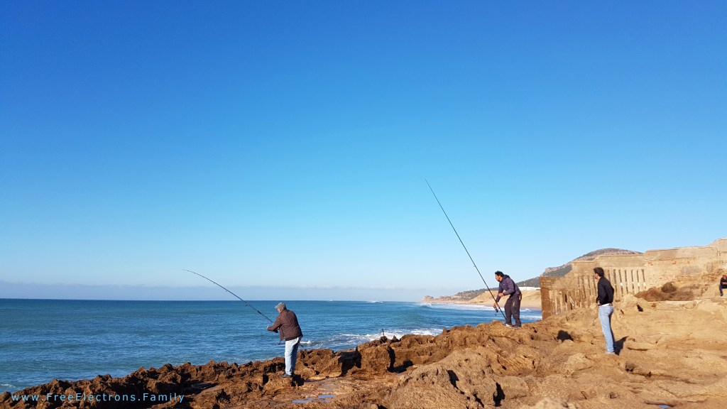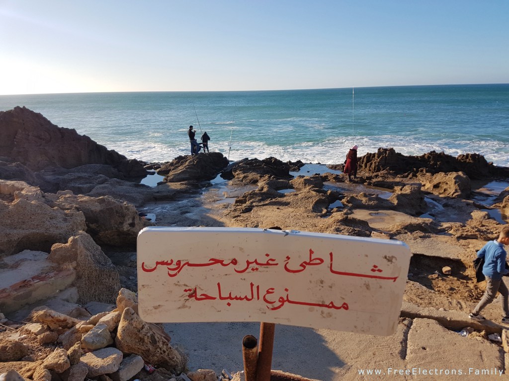 Storytelling in the caverns at its best, as in the stories of old, Mama style! Brave men fish here (that wave in the background actually reached me). Maybe a little inspired by the Phoenicians, the boys dig outside the Caves of Hercules.Yeah, I don’t know what this reads. I think it means, “Don’t be stupid. Rough waters can come crashing quickly over these rocks!” All tourists must, at some point rest. You can get coffee, ice cream, food and… restroom here! Photo credit: Sam Zhang/GMAP.Suburb of Tangier. Looks like California.