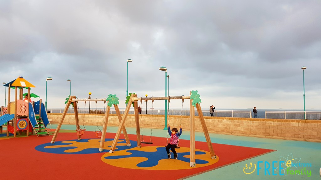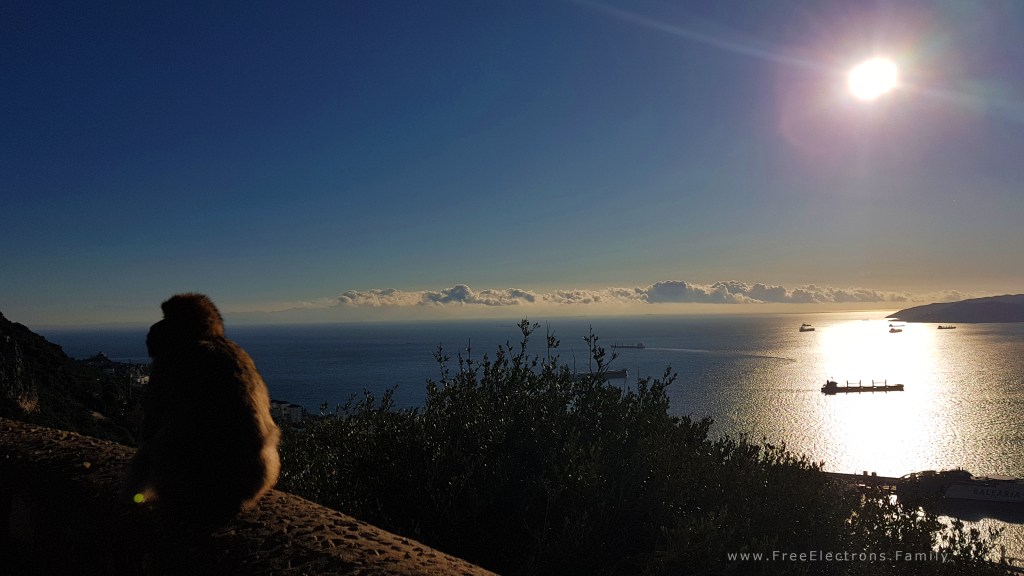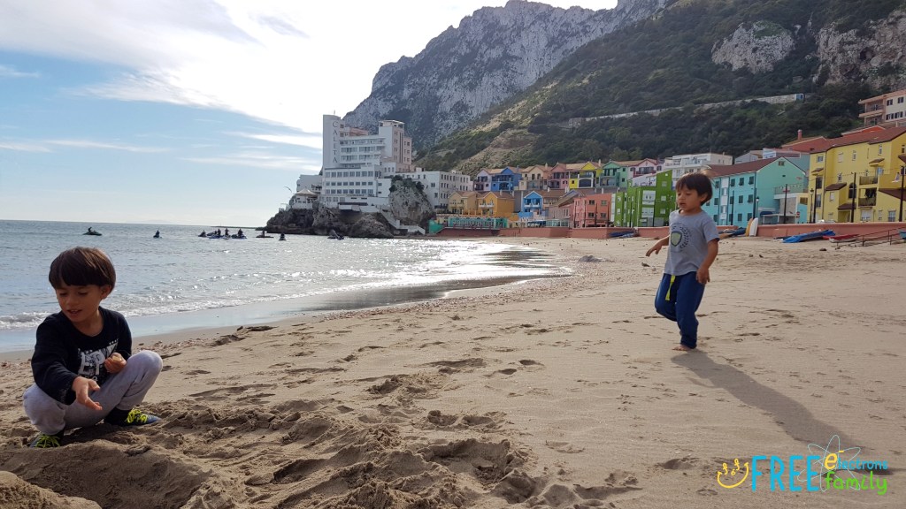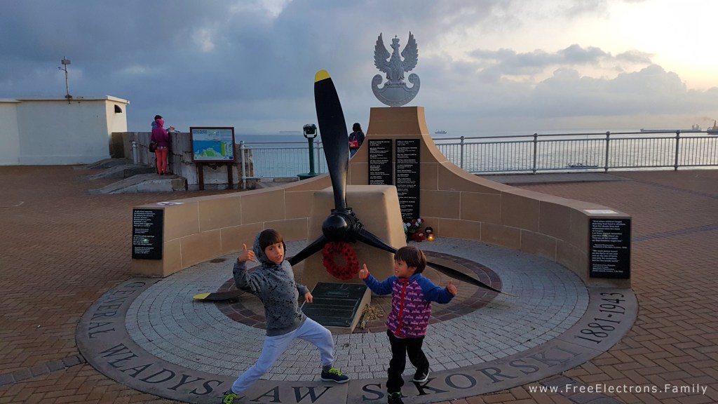 Man and monkey look out into the distance, watching ships set sail and the sun sinks down to set, thinking. . . probably nothing at all.Beach play in December on Catalan Bay–one of the five beaches in Gibraltar. The colorful houses brighten up this small patch of sand. Thanks to the original inhabitants from Genoa, Italy who dominated this area so much at one point that the locals spoke Spanish, English and Genoese interchangeably, apparently. See more of the beach while our kids free play with their toys through the video-link below.Prayer time as the sun set over Gibraltar’s mosque–King Fahd bin Abdulaziz al-Saud. It’s a beautiful mosque. This beautiful mosque overlooks everything else at Gibraltar’s southern Europa Point. On a good clear day, you may be able to see the Atlas mountains of Morocco.Europa Point Playground with a view: Young children can play in this clean and ample playground while parents rest, read a bit about Sikorski and enjoy the scenic views over the Mediterranean. There is also a football/soccer field nearby that, if you are lucky, can enter and play in.Who in the world is WΕadysΕaw Sikorski? He’s a pretty big-deal figurehead for Poland. So, here goes, he is a Polish military and political leader who fought for the independence of Poland from the Russian Empire and later on became the 1st Prime Minister of Polish government in exile during the Second World War. He crashed in an airplane accident just off of the shores of Gibraltar.The northern Pillar of Hercules sits on this Rock of Gibraltar, at least according to the legends of old. The southern one sits somewhere in Morocco, close to the Spanish ex-clave in Ceuta.Top of the Rock viewpoint–only some 412 meters above sea level but impressive since it’s practically the Mediterranean almost everywhere you look. You can climb up to near the top but it was a little sketchy for young kids. . . and unfit parents like us.