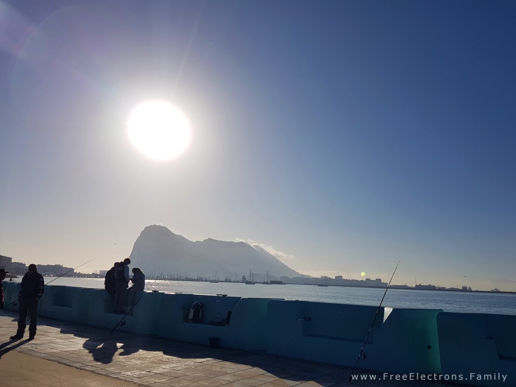A dramatic approach along the Algeciran coastal road to Gibraltar–that hunk of rock under the sun that you can see on the picture. Fishermen cast their lines on the busy Bay of Algeciras.