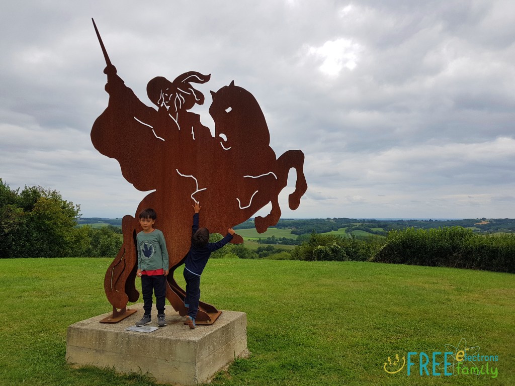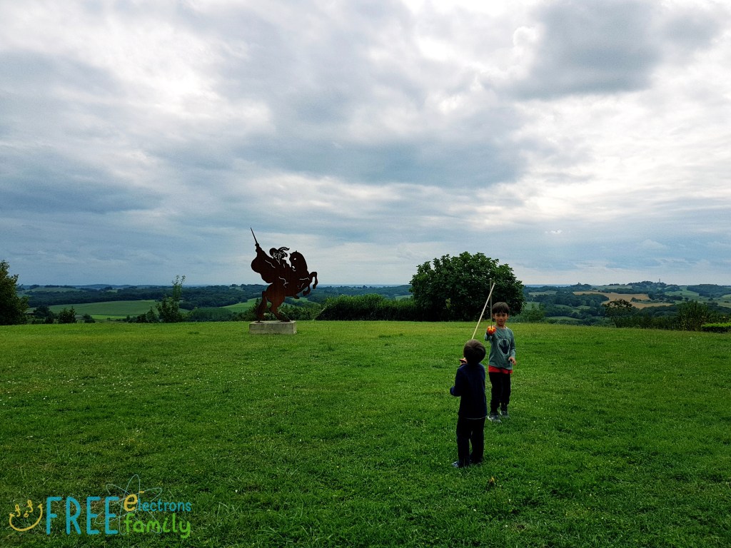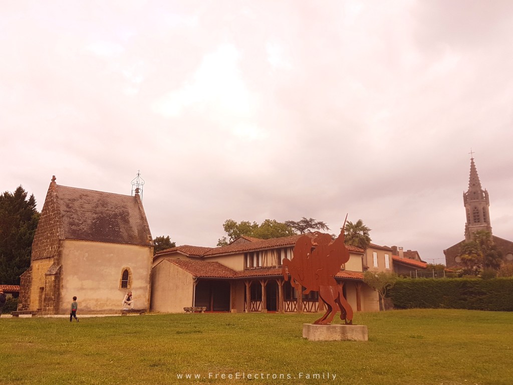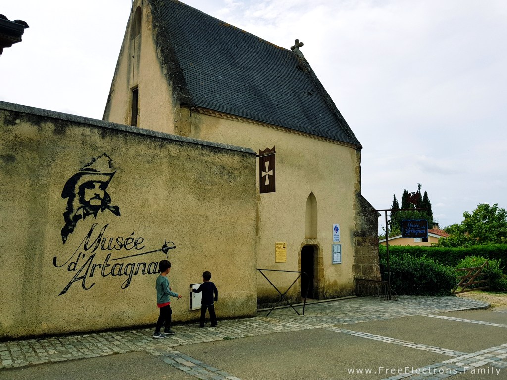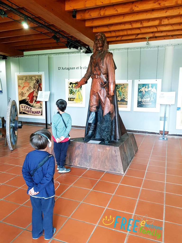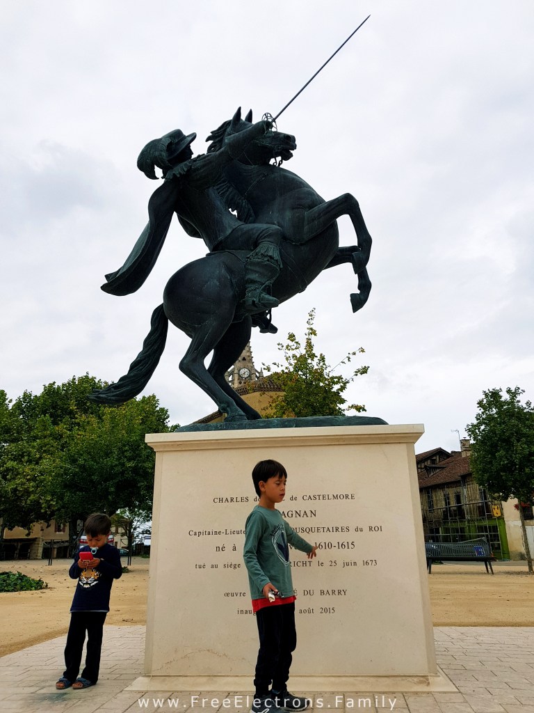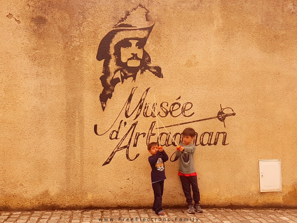 Finally, after 5,000-something kilometers, on the return trip of our family camping road trip, we made it to the musketeers. It was actually a surprise for the boys because we did not tell them until they. . . well, saw the signs!Ahhhhh, finally! Dine and drinks and d’Artagnan at the only plaza in Lupiac… But there’s nobody here and everything else, apart from the museum, was closed. Bummer! We (the parents) were looking forward to the local “Wolf Bitch’s Brew Beer”.Saluting their captain hero, the boys raised their swords and yelled, “One for all, all for one!”–The English translation of the rallying call to arms of the musketeers in Alexander Dumas’ novel “The Three Musketeers”. The BEST part? KIDS are FREE! That is, the entrance of โฌ5.50 is only per adult! YaY!