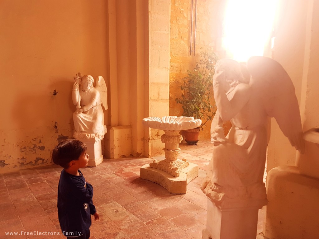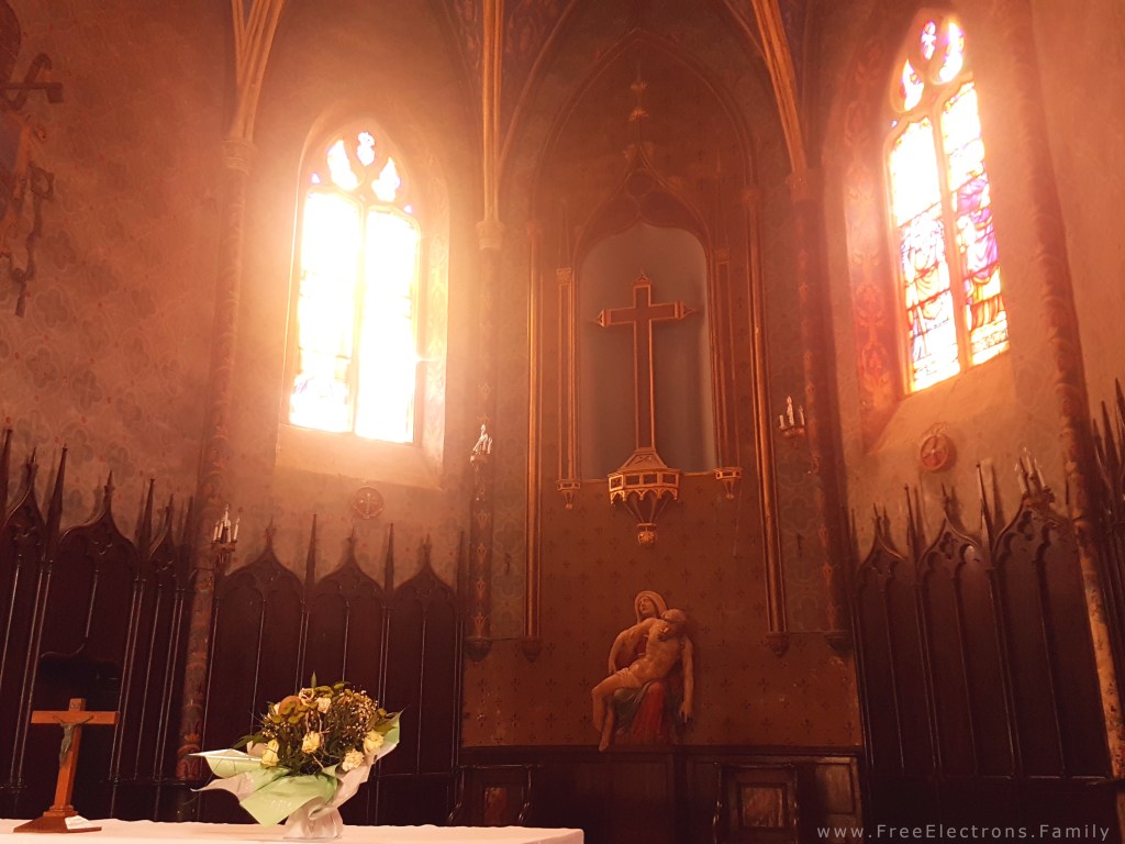 Traditional houses at the center of Lupiac-village of the wolves who hold fairs on Saint George’s day and also on the day of Saint Loup–literally “Saint Wolf”! Here’s a little story from a plaque around town: in 1819, the mayor and the local officer in charge of hunting wolves noted that 14 wolves, she-wolves and pups had been killed within the municipality, then 19 wolves the following year. 31 years later, wolves had all disappeared from the area. The coat of arms of the village at that time featured two wolves. And now?An iron-clad (literally) d’Artagnan watches his museum while pointing his sword ( technically a “rapier”, a secondary weapon of a musketeer). . . maybe at the ghost of Cardinal Richelieu at the tower of Saint Bartholomew’s Church. Kids@play. “En garde!” ( On [your] guard in French), commanded Karol. “AAAAAHHHHHHHHHtttttttattattaccccckkkkk!,” responded his younger brother! Ohhhhh, how stories come to life. . . when we were young!“Un pour tous, tous pour un!”–the “original” rallying cry of the musketeers was actually originally Latin: “Unus pro omnibus, omnes pro uno” which, curiously, is the unofficial motto of Switzerland. Really?Inside Saint Bartholomew’s Church… one of those rare moments when the young one was quiet. . . for a long time. We wondered what he was thinking. And he wouldn’t say it. Hhhhhmmmmm. Saint Bartholomew’s Church. Small church open to the public. This is one of the 3 remaining churches and chapels that survived the French Revolution (you know, when the King of France and later his Queen Marie Antoinette were beheaded, and later a small man with really big. . . ambitions, called Napoleon, kicked out the revolutionaries and seized France). All the other 11 were destroyed. The addition to the Gothic northern wall of the old church was made in the mid-19th century. The church contains a remarkable 16th century “Pieta”, made from 2 varieties of wood–lime and poplar.