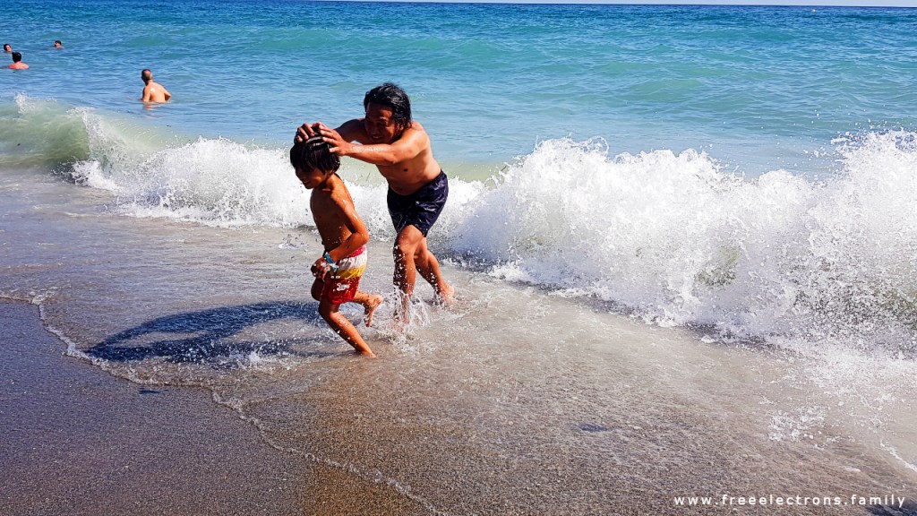 The clean yet coarse sand actually hurt the feet. Combined with strong waves over 2 meters tall at about 1700h in early July, it was actually not a pleasant swim, as the waves would pull and us (and the little ones) into the sea and drag us through the sharp little stones. But that did not stop us from dipping in, even for a real quick one.