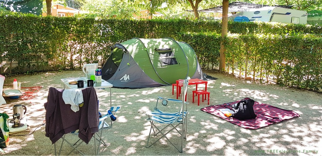 How’s the pitch/plot? Big square area on gravely ground–two times the size of a normal pitch-plot that we’ve been camped at so far. This gives our boys more area for private play. Our camping area had about five meters length each side.
