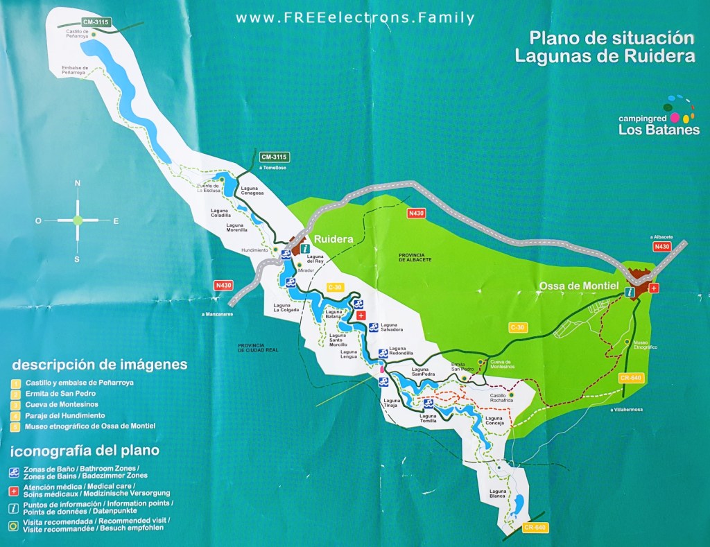 Campingred Los Batanes sits almost right in the middle of these chain of 15 Lagos (lakes) de Ruidera in this province of Albacete with emerald green waters, beautiful scenery and interestingly colorful geological features, natural dam formations and ecological environment. The viewpoints Mirador Laguna Lengua and Mirador Laguna del Rey are easily accessible with parking lots.