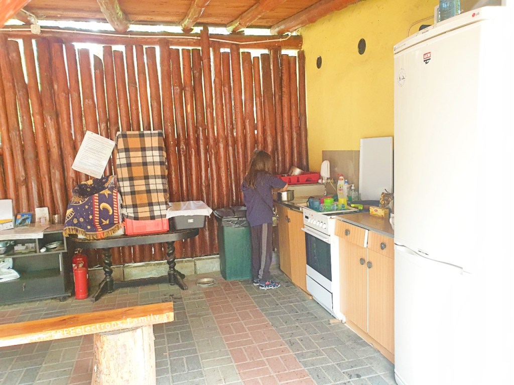 Dishwashing area is right next to the bathroom–outdoors next to the fridge. Small sink hard to get a jug water in, to fill it. You’ll need smaller water bottles to do that.
