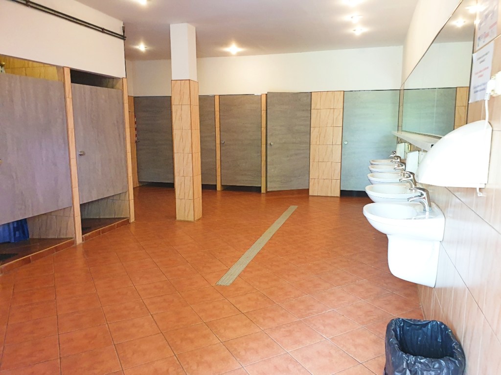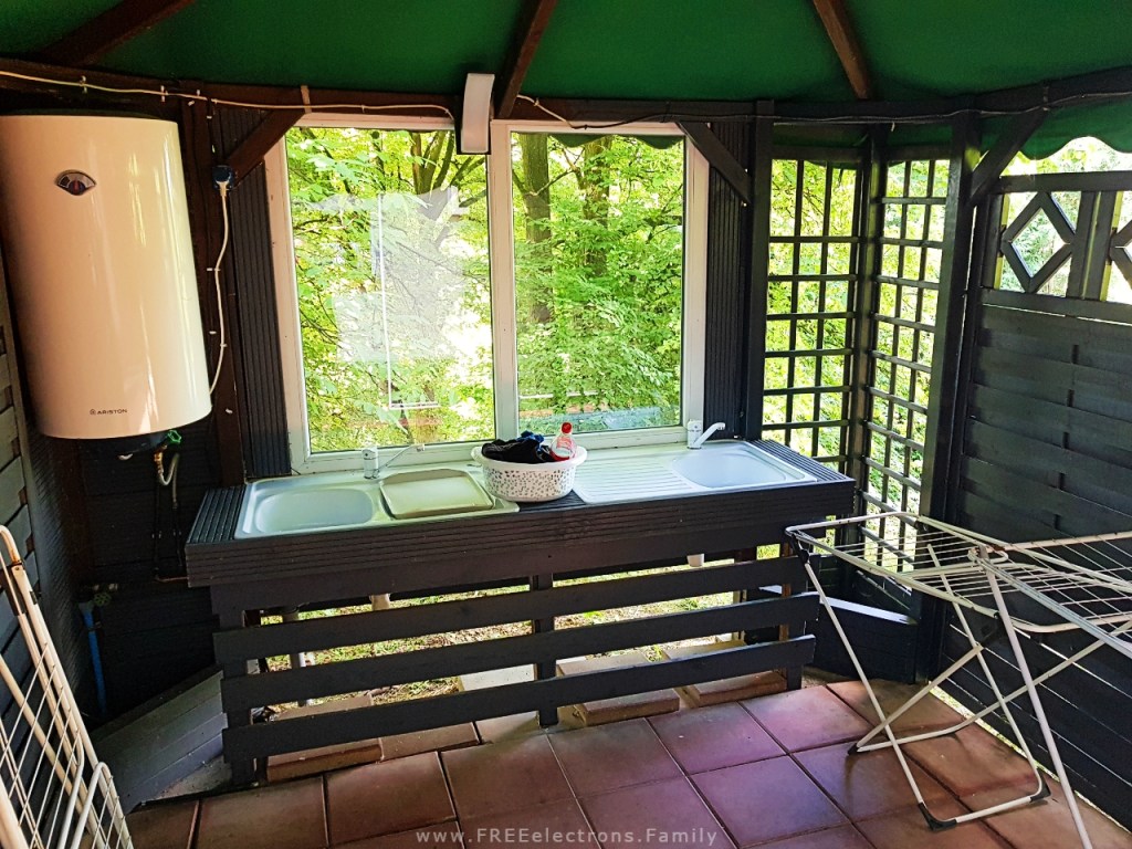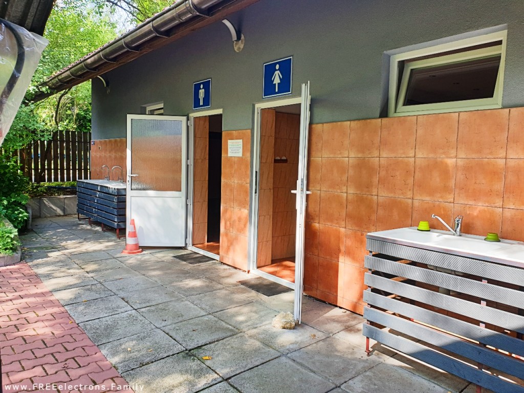 Covered outdoor laundry with racks for manually washing and hanging clothes. When camping in Poland, it helps to have covered facilities because you can almost be sure that it will rain in the summer.There’s a laudry machine in a room across from here.