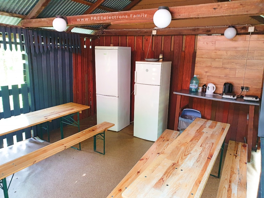 Covered outdoor kitchenette with 2 sets of tables and benches, refrigerator, portable stoves, kettles and electric plugs that made us wonder why we paid for electricity in the first place.
